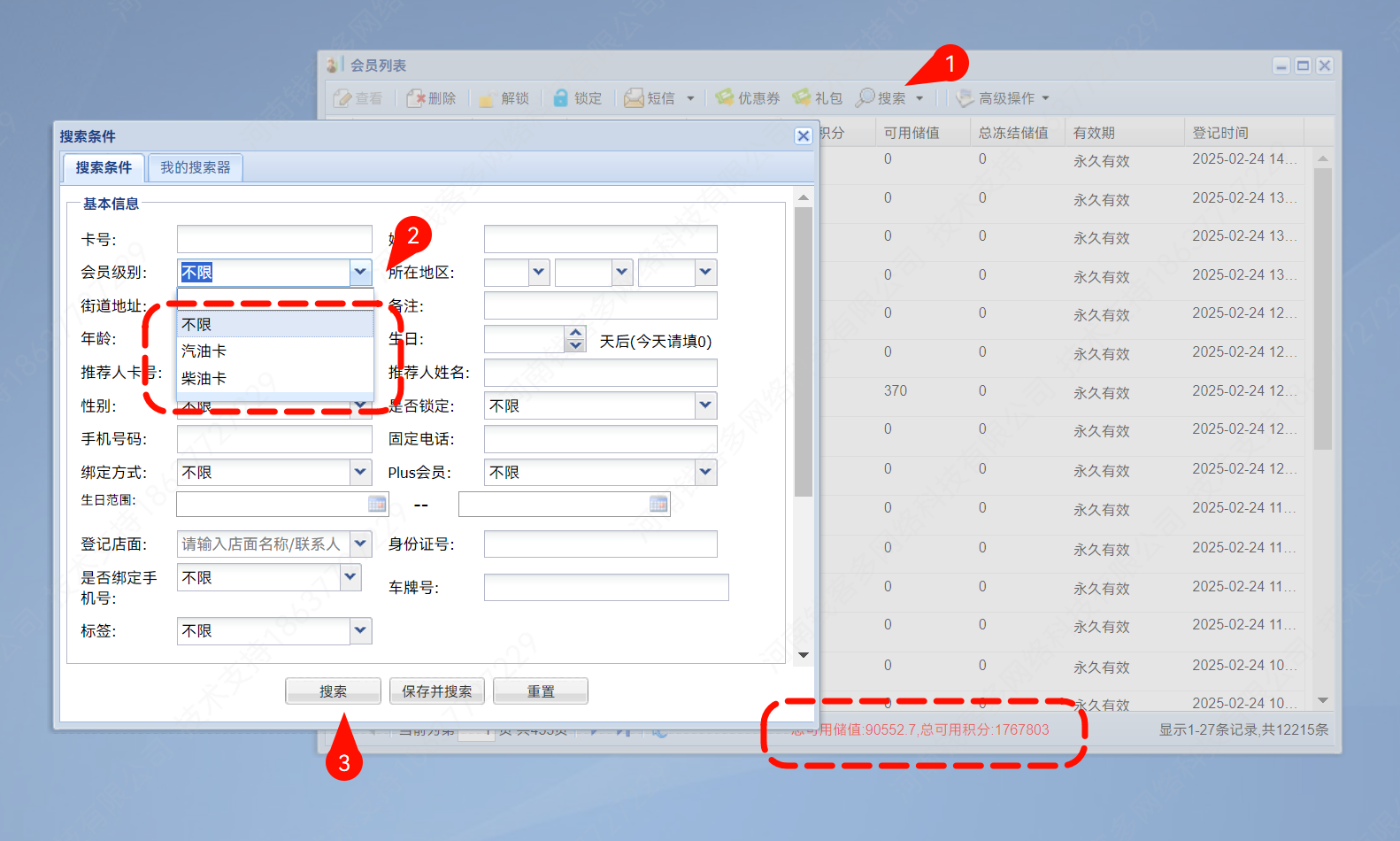 如何查看可用积分、储值?会员列表-可用储值、可用积分查询 土拉 钱客多 » QKD-会员管理 321热度 会员列表可以看到每个会员的可用储值和积分,在页面最下方可以看到所有会员的可用储值和积分 默认显示可用储值为所有会员储值 如果想查询某类型卡储值余额,按照下方步骤搜索汽油、柴油卡