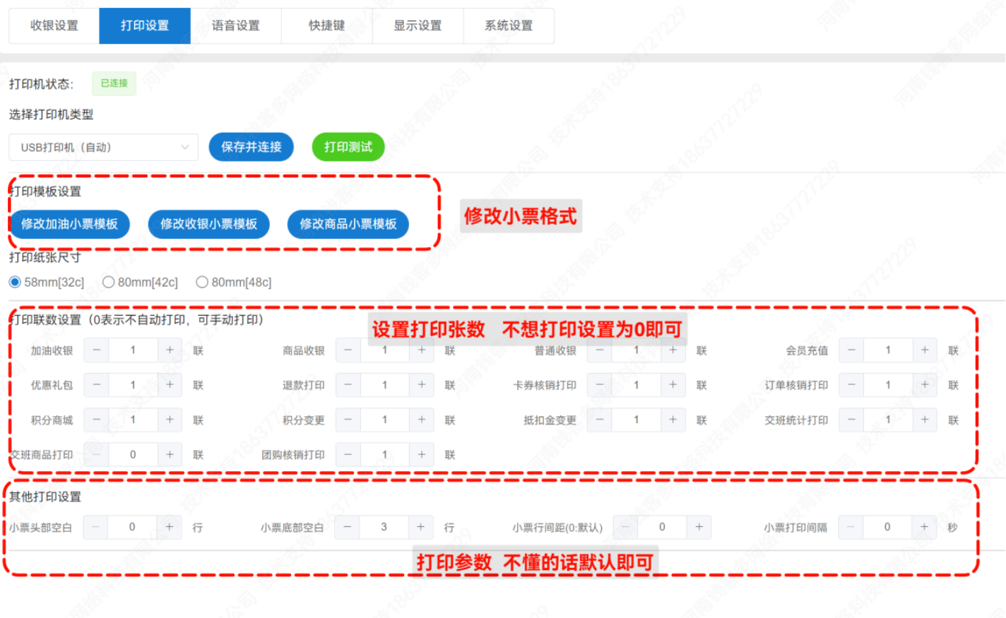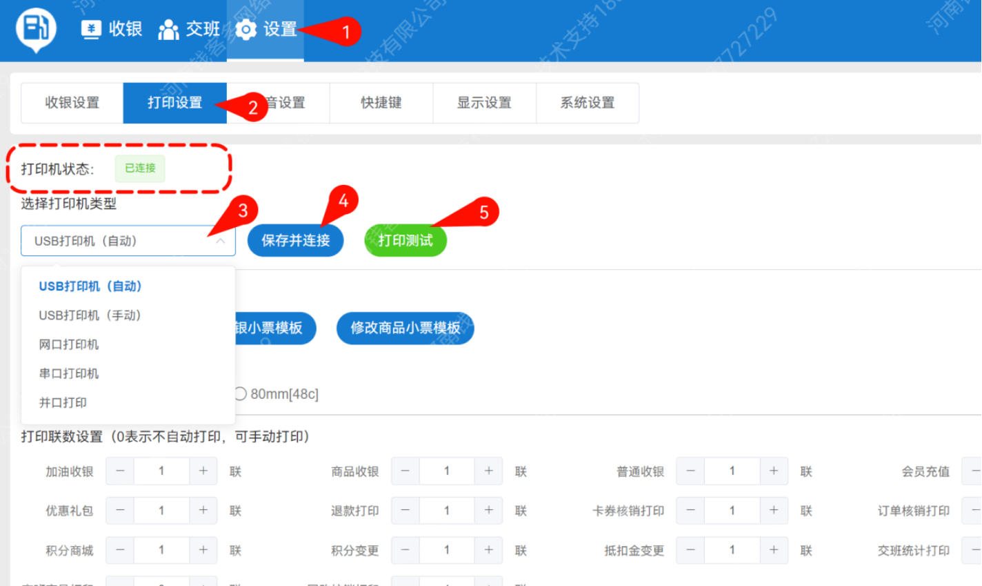 配置usb口打印机的时候可以自动识别,按照序号步骤点击 保存打印测试,观察状态为已连接即可打印