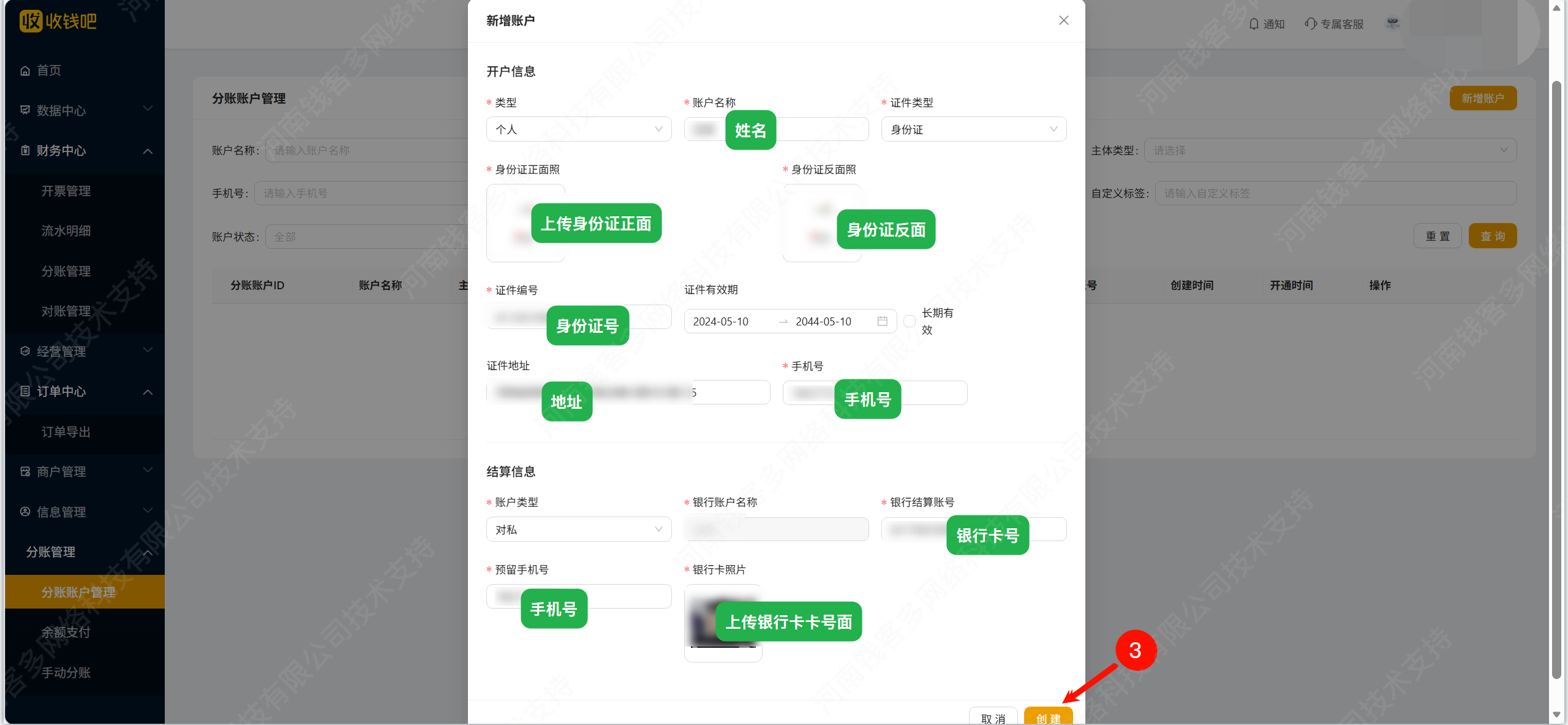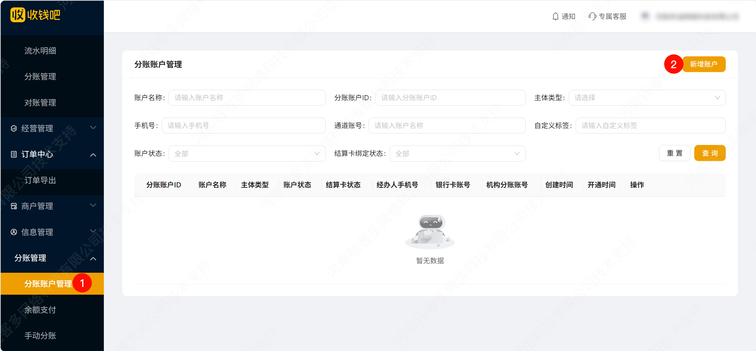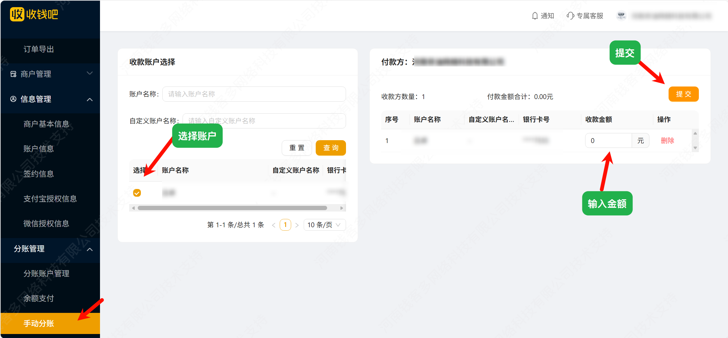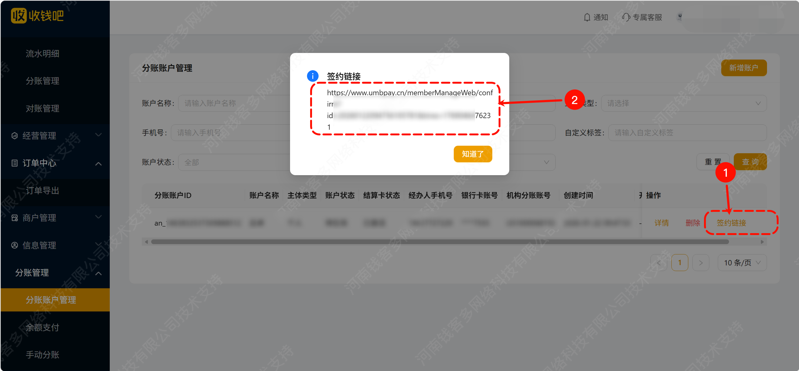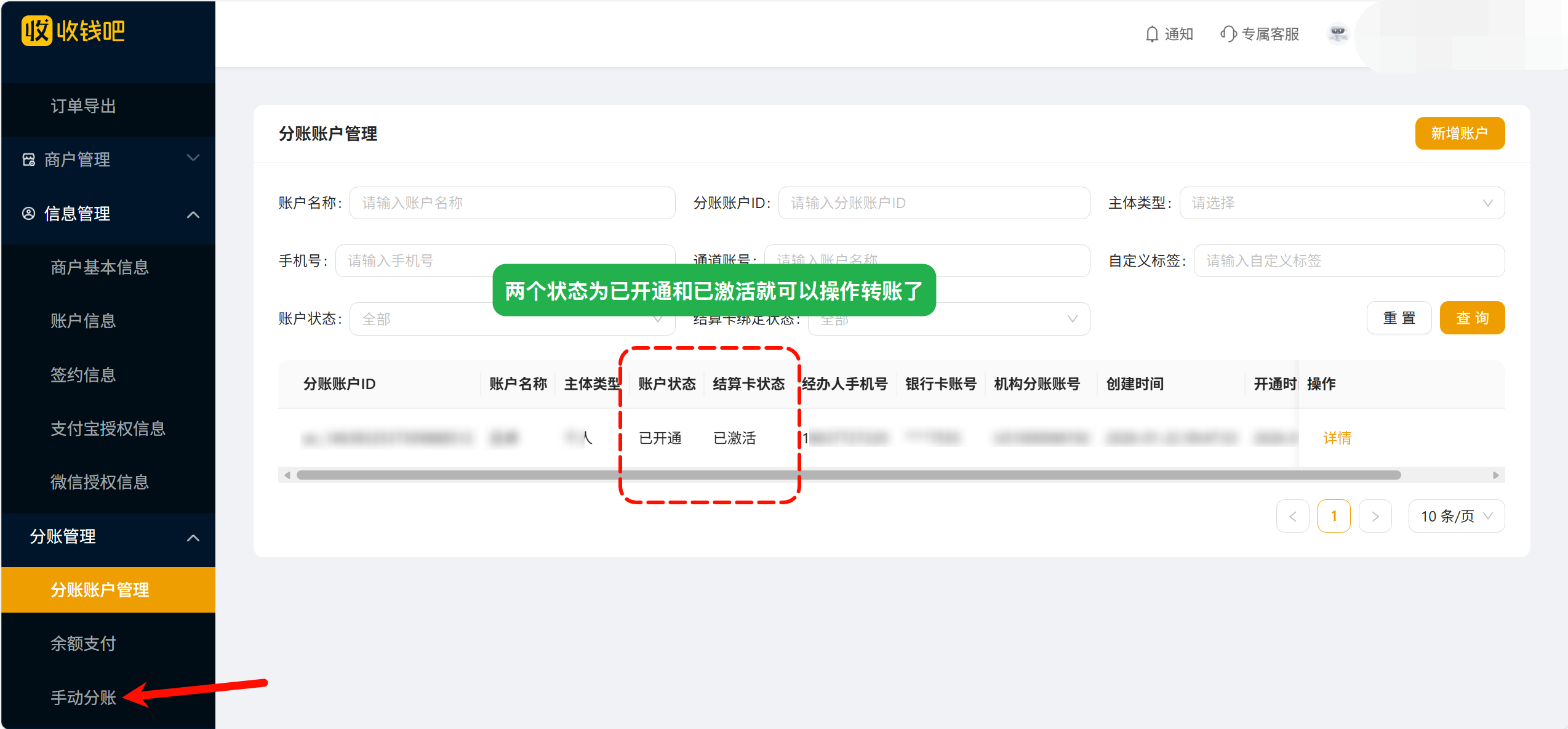 中投科信收钱吧分账账户申请、签约、转账步骤 土拉 收钱吧 321热度 1、新增分账账户 预留手机号要匹配银行信息验证,上面那个手机号接收签约短信(可以留自己的) 2、创建完成约5分钟左右可以看到签约链接,打开链接获取验证码签约 3、签约成功10分钟左右账户状态已开通、结算卡状态已激活就可以操作手动分账 4、选择账户、输入金额、提交