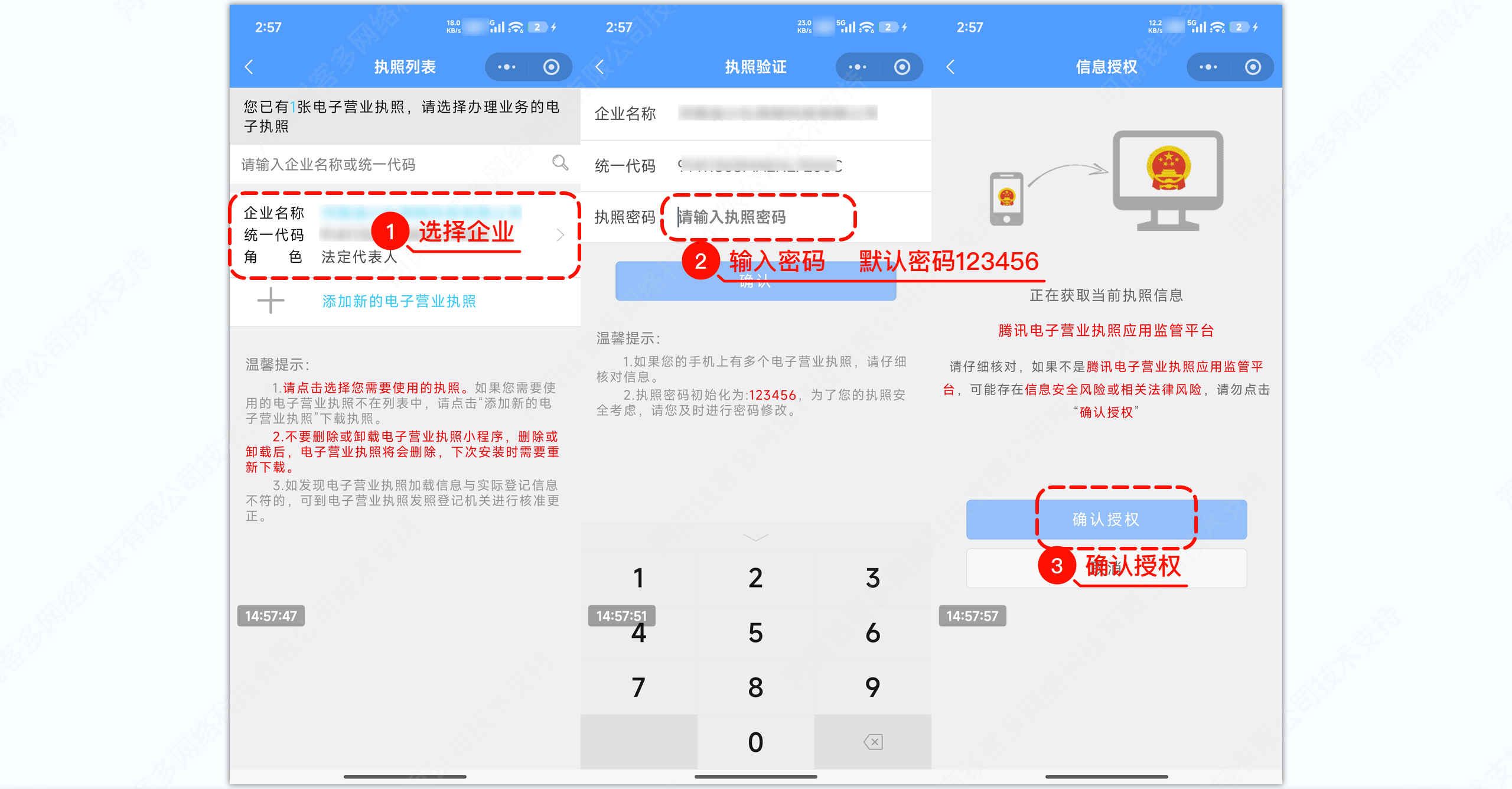 主体验证信息-主体验证方式-电子营业执照 土拉 微信公众平台 319热度 操作流程 1.请使用微信“扫一扫”功能扫描左侧二维码 2.企业为办事人精准授权时,授权事项请选择“电子商务-电商-资格核查” 3.扫码后企业法人或办事员需对电子营业执照的使用进行授权 4.首次使用电子营业执照功能,请先登录“电子营业执照”小程序或app申领并下载执照,再进行扫码授权若授权环节出现异常 请刷新重试