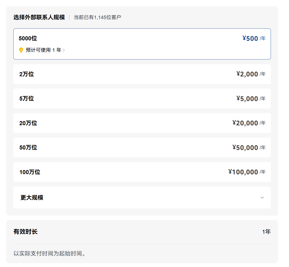 外部联系人规模和购买费用