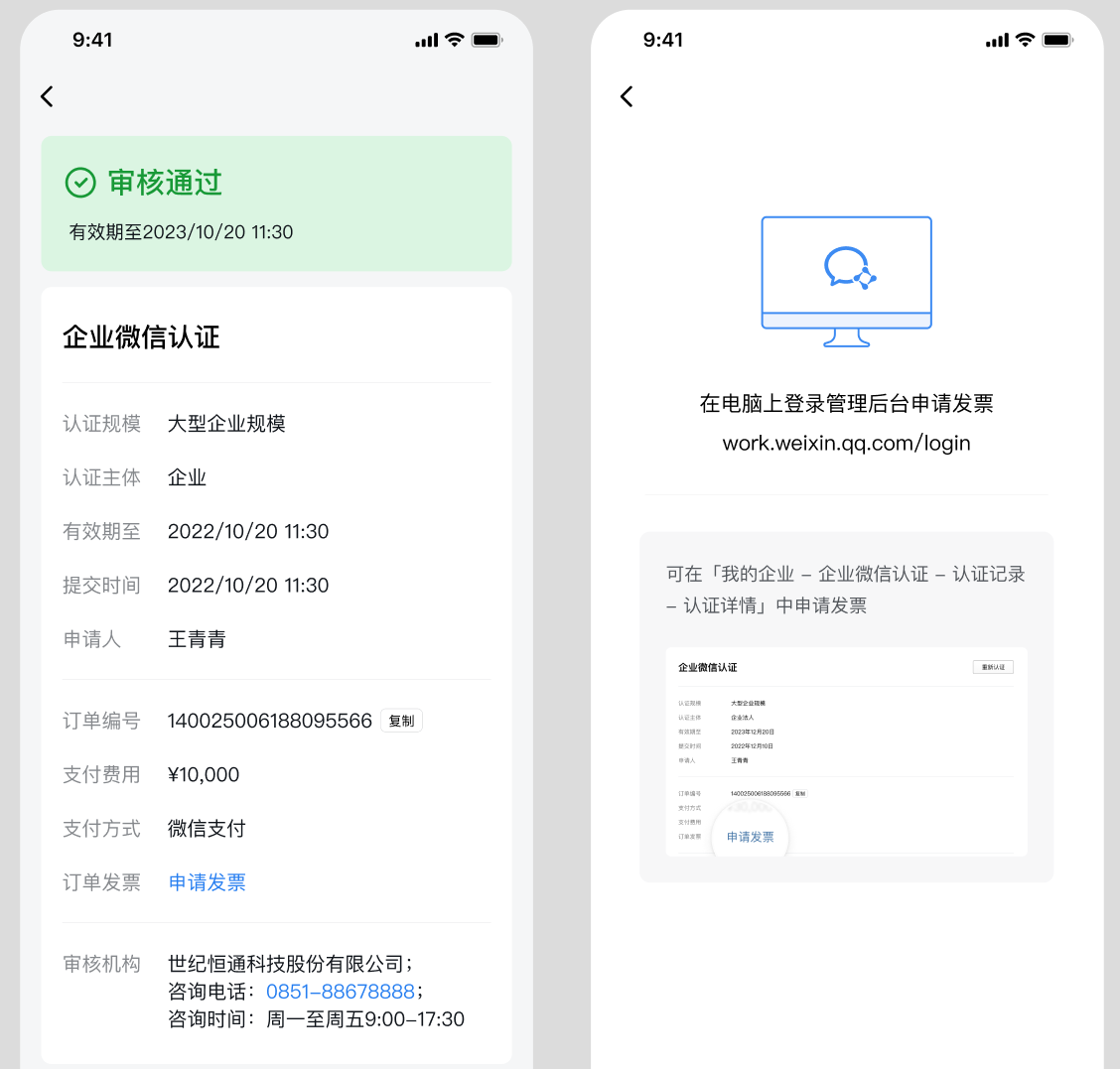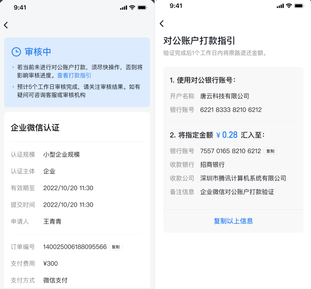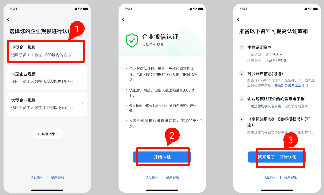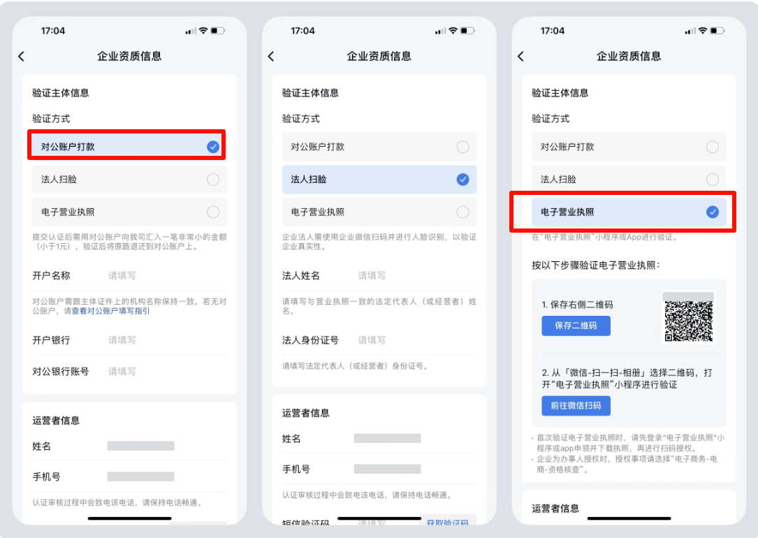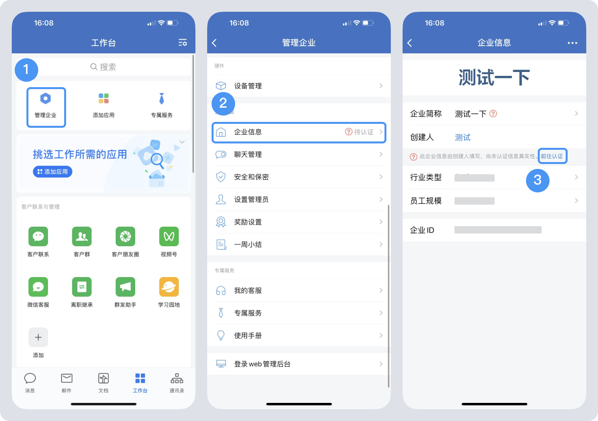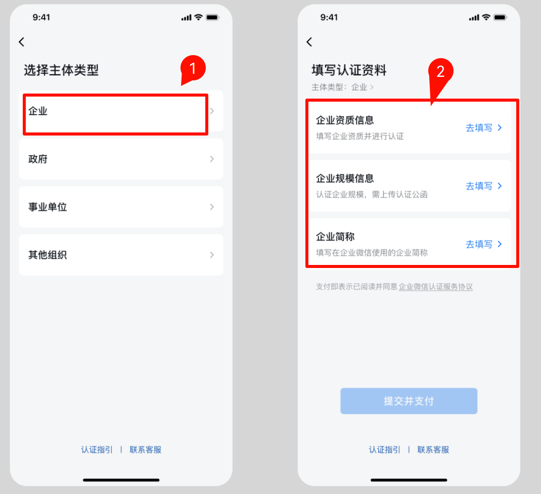 如何进行企业认证 土拉 企业微信 317热度 1、认证入口及选择主体类型 超级管理员在【手机端->工作台->管理企业->企业信息->进行认证】 选择认证的主体类型,开始填写认证资料。 2、选择主体验证方式 企业类型,目前支持对公账户打款、法人扫脸、电子营业执照三种主体验证方式。(一般公户验证或者电子营业执照最为方便) 3、填写运营者信息 3、填写企业简称 5、支付审核服务费用 6、认证审核