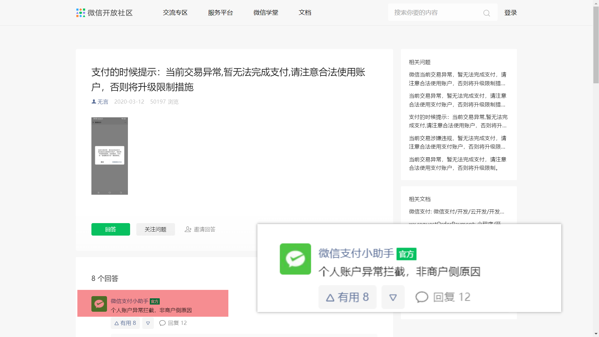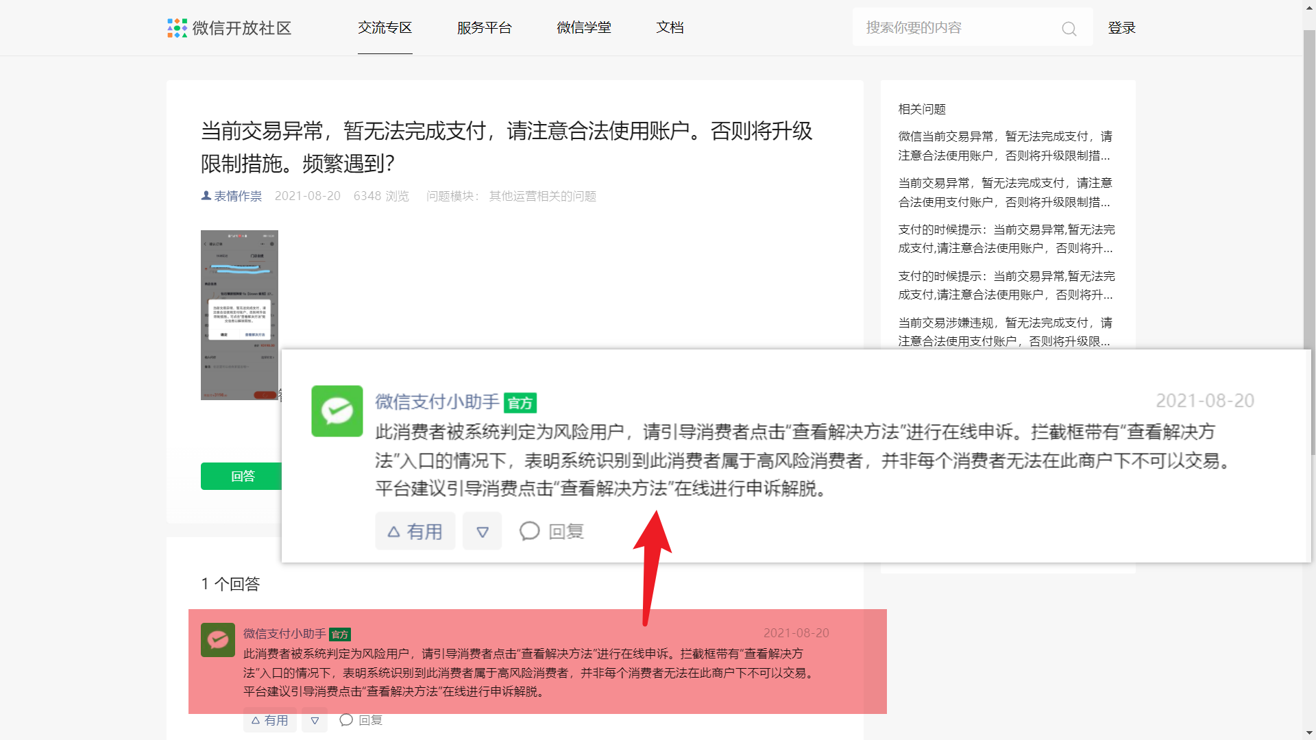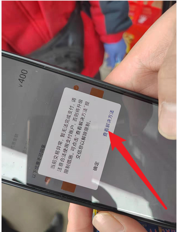 支付的时候提示:当前交易异常,暂无法完成支付,请注意合法使用账户,否则将升级限制措施 土拉 支付认证 315热度 图一官方回复 图二官方回复 属于身份信息或相关资料存在疑点,或交易行为、交易情况出现异常。 如果是微信个人支付帐号异常,建议点击查看解决方法/拨打95017客服协助处理。 解决办法:点击查看解决办法,按提示填写资料即可