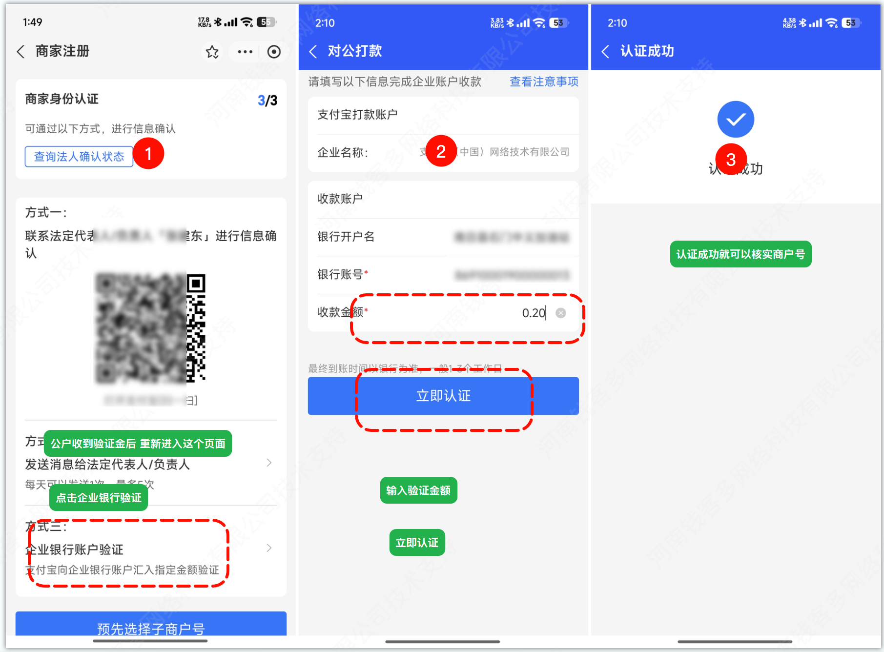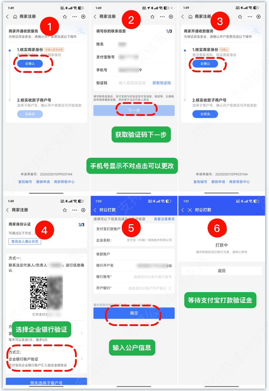 联系人/非法人公户验证核实商户号 土拉 支付认证 325热度 微信注册商家获取打款验证信息公户打款 公户打款后(一般半个小时就过了)进入商家 核实商户号 支付宝注册商家填写公户打款 公户收到验证金进入填写验证金额 进入商家核实商户号